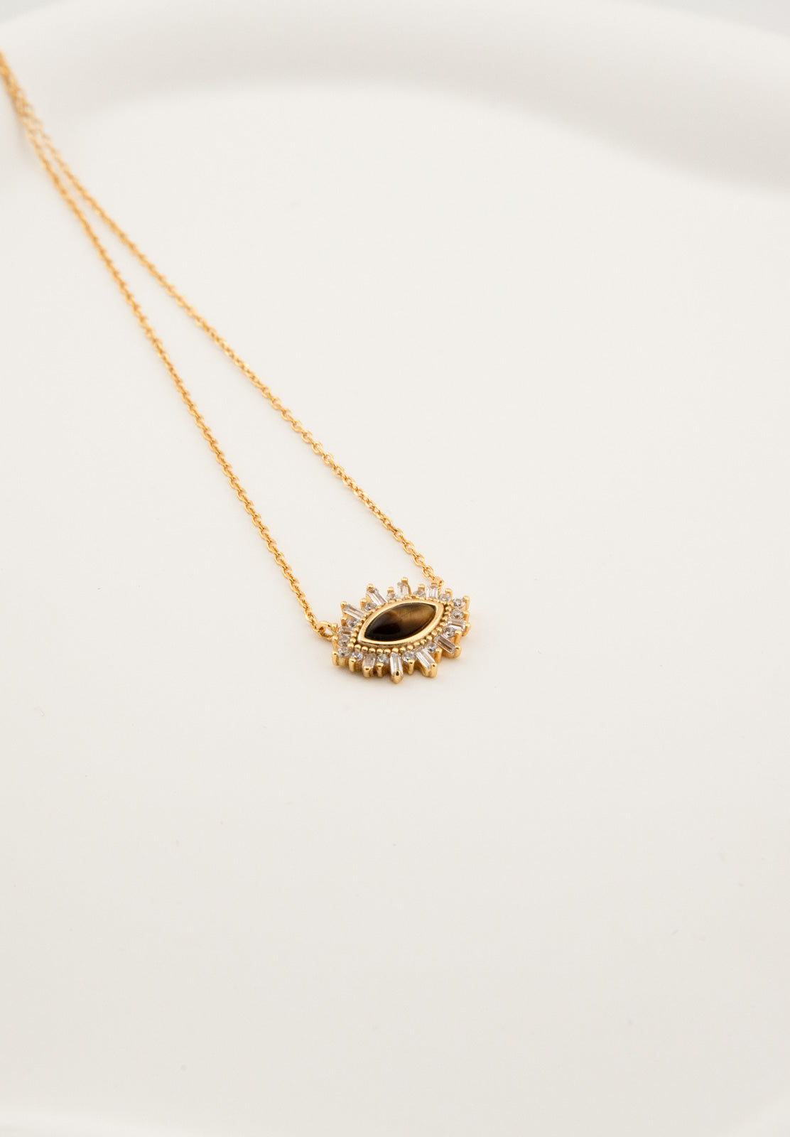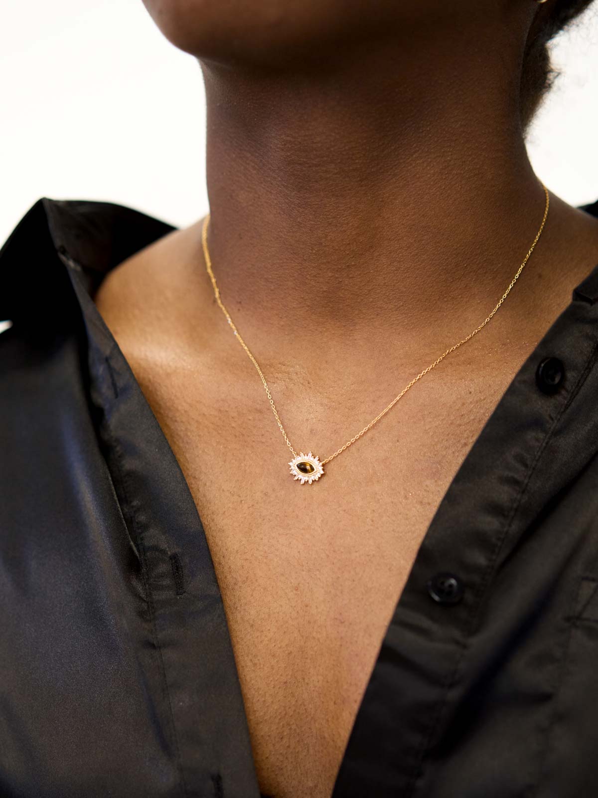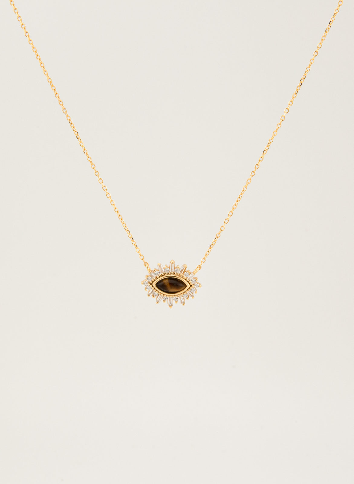 designed with an eye-shaped centerpiece with a radiant, detailed border, giving it a mystical and protective feel. Crafted with 18k gold vermeil over sterling silver with tiger's eye stone.