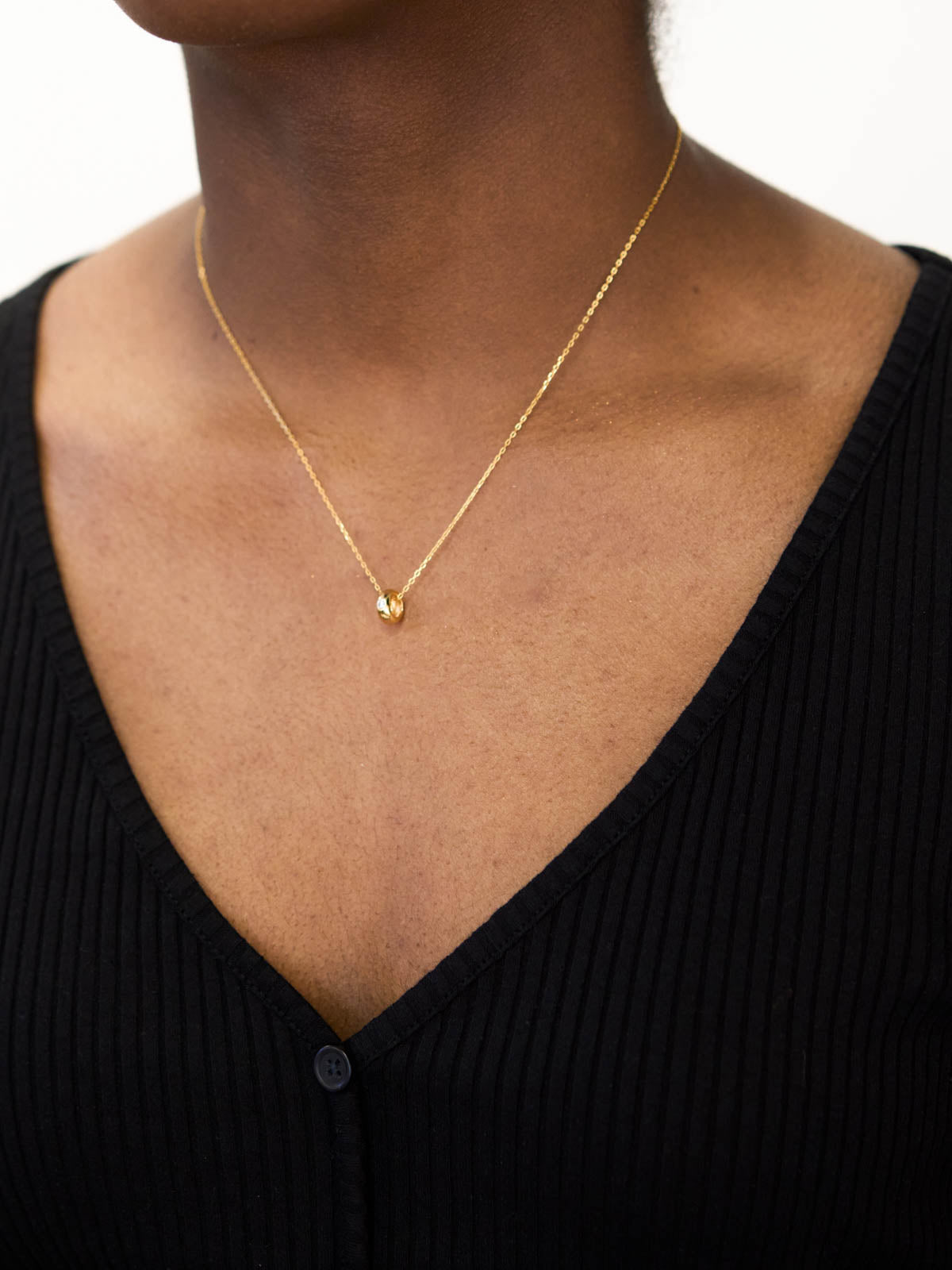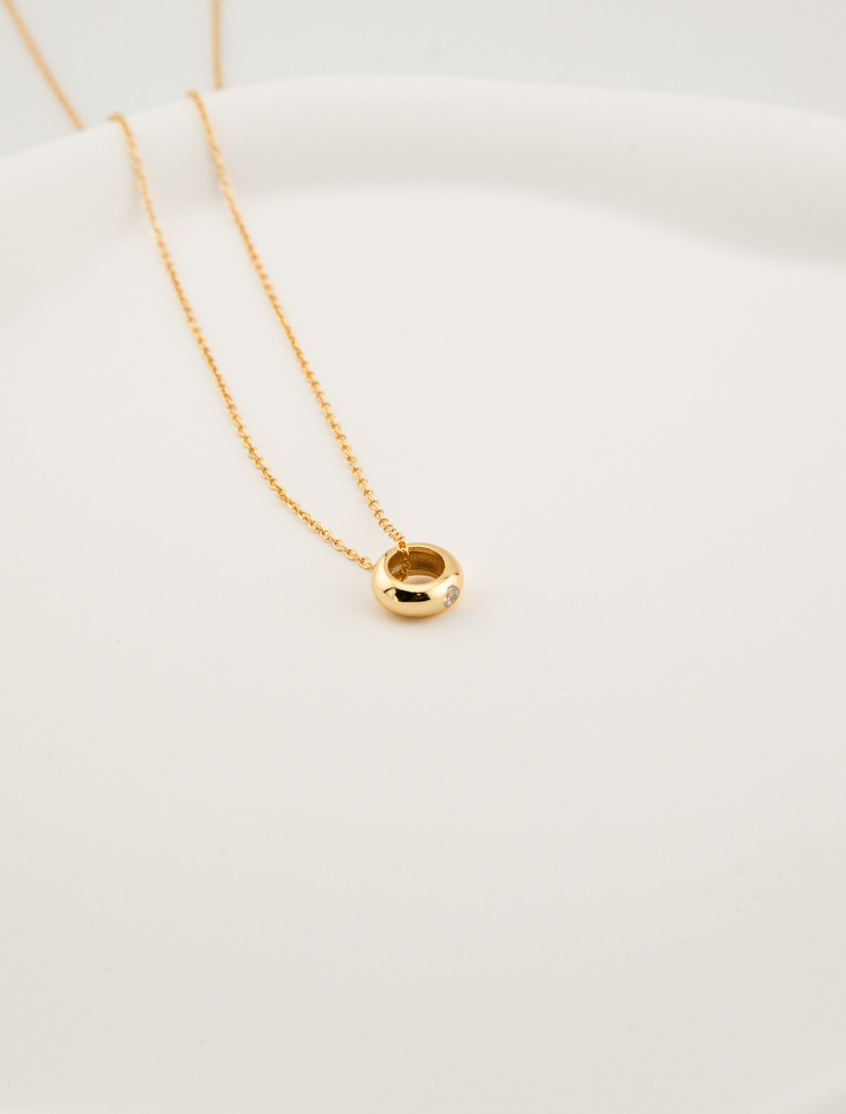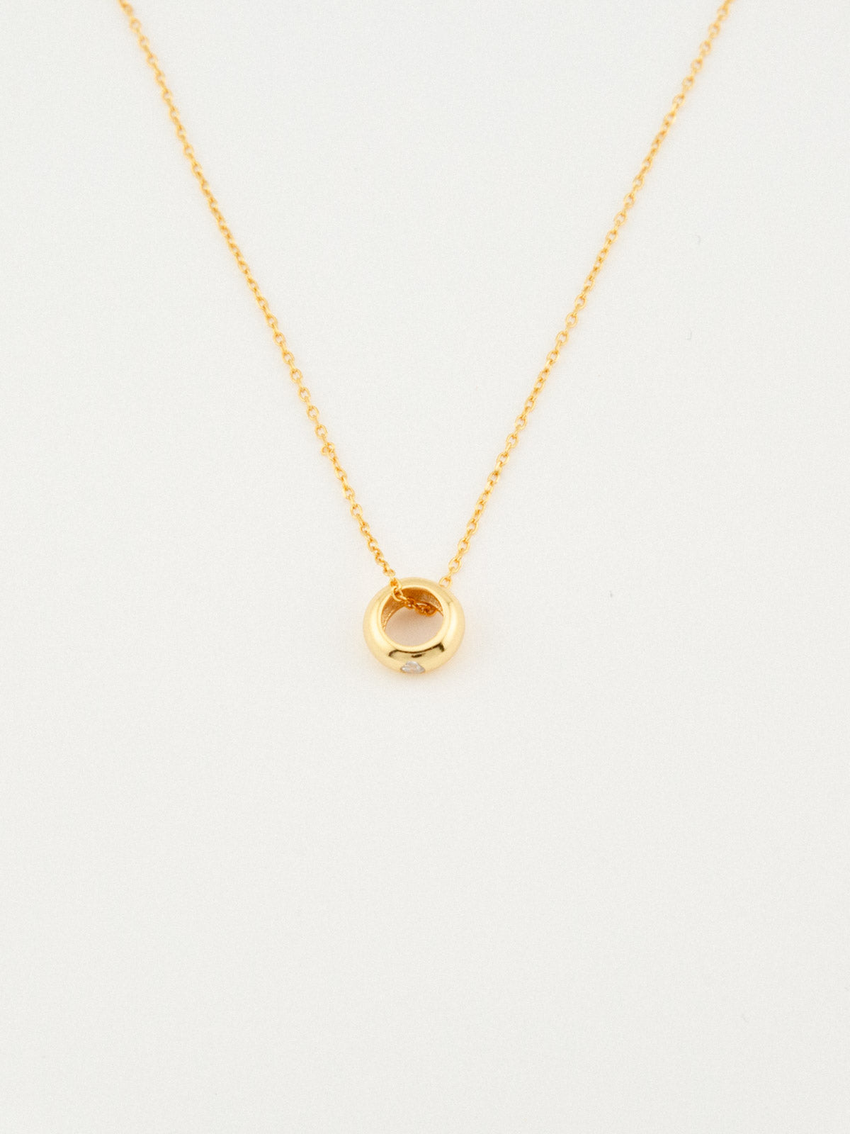 This elegant pendant necklace features a sleek, rounded design with a delicate zircon stone at its center, adding a subtle sparkle. Perfect for daily wear, it effortlessly complements any outfit with its timeless charm.
